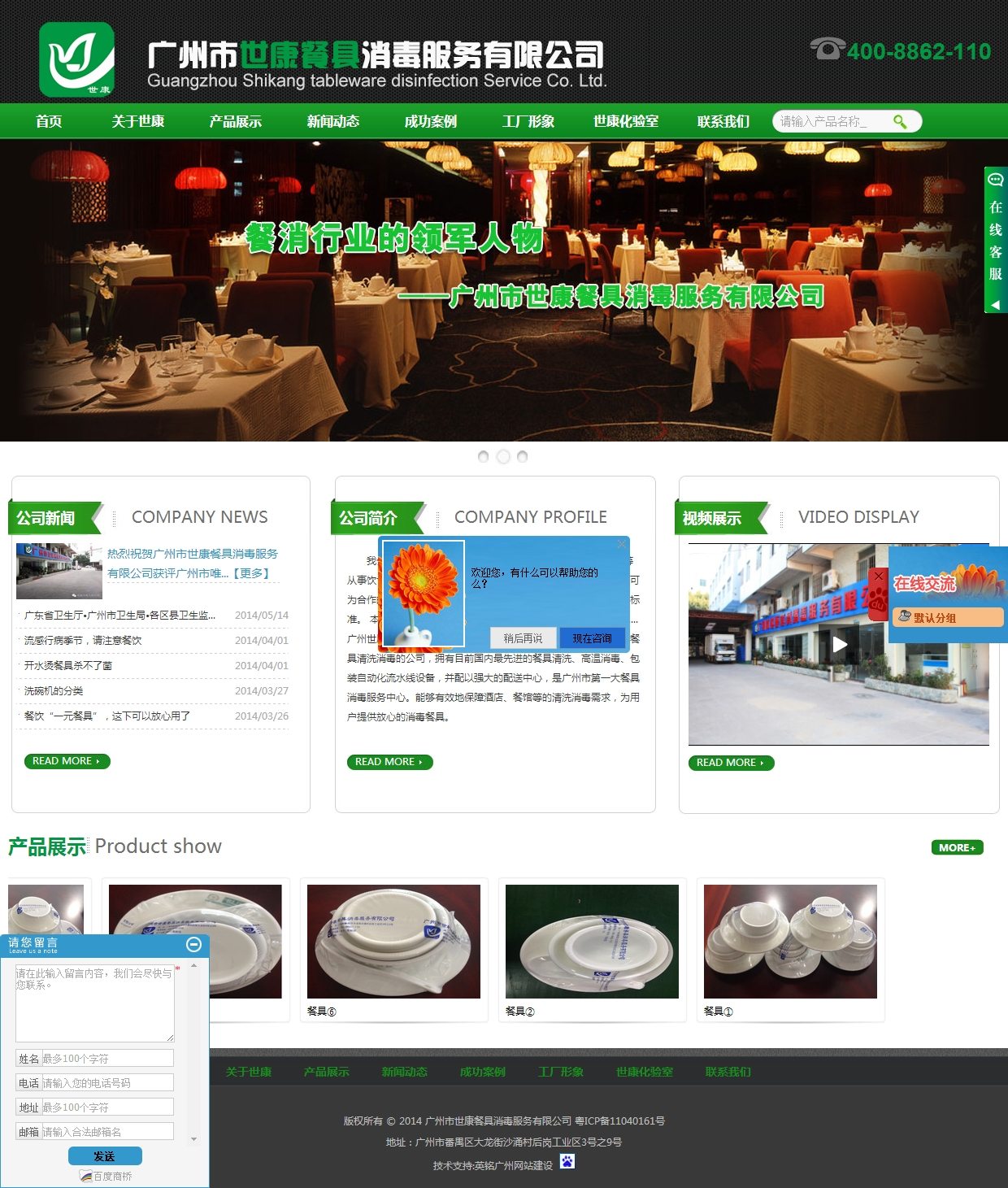广州市世康餐具消毒服务有限公司(鸽子,绿色树木,水,阳光象征人类健康和谐的四要素幻化成世康公司的LOGO)是一家集餐饮具清洗消毒配送服务于一体的大型企业,自08年成立以来,世康公司一直引领着餐饮具清洗消毒行业的潮流,推动着整个行业升级和发展的龙头企业,世康公司位于广州市番禺区大龙街道沙涌后岗工业区,占地面积4000多平方,严格按照国家,省,市相关规定要求,投入巨资全力打造了结构合理、布局规范、安全和谐、机制健全、理念新优、客户满意的消毒公司。世康公司吸引了广东省卫生厅·广州市卫生局·各区县卫生监督所的卫生部门领导参观指导,吸引了国内各大城市及周边国家地区的同行业的参观和学习。